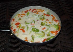 Put this pan in the BBQ and cook the veggies until they are semi cooked (asian style)