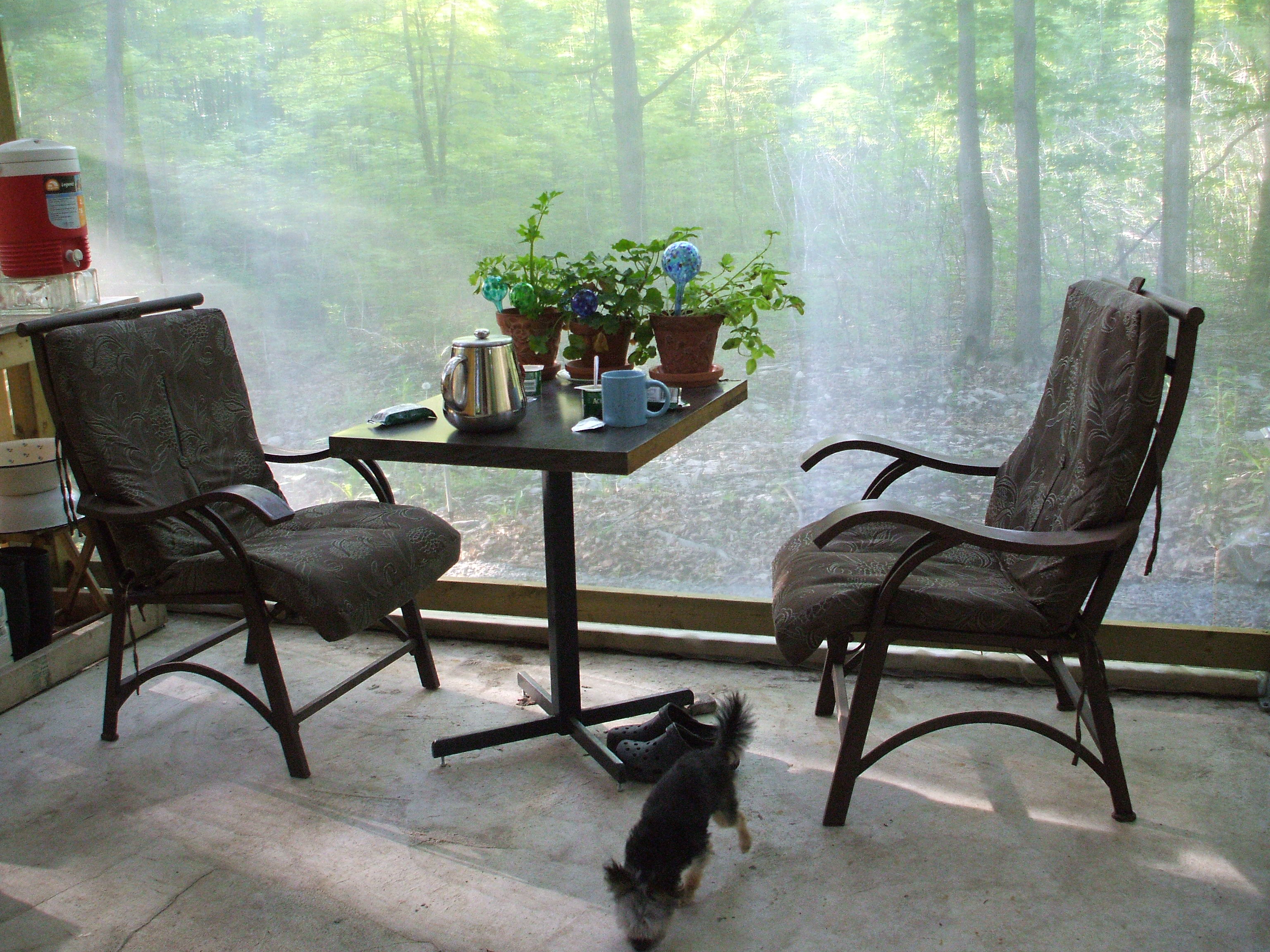 It is a typical morning at Tiny House Ontario. There are no electronic interruptions. There is no news from the outside world. We know nothing of the last 12 hours as we quietly sit and eat breakfast, chatting. We pat the dogs some more, laugh at the silly Bad Little Wolf who is harassing his sister and jumping around. I break the pattern to record this Sunday morning at Tiny House Ontario for you.