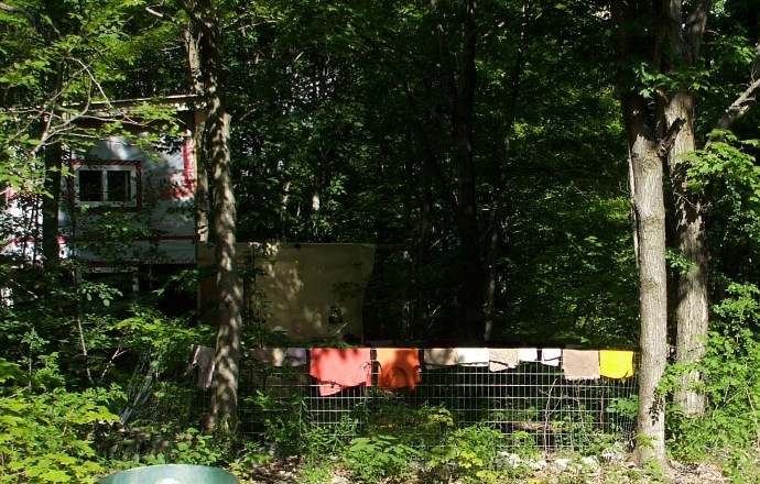 I do a little bit of wash on the old glass scrub board if, for example, there is something that might stain. Otherwise I put it in my Chicken Little backpack and drive to town to throw it in the wash at Lavergne’s on Montreal Street in Kingston. I only want to do one load at a time because I bring it back to dry and have only so much fence to hang it on. In wanting to allow only let one load get dirty, I have to decide what to wear by the week. What I mean, is if I choose to wear red then I stick to red/pink/yellow all week, like wise, blue/purple/green and black/grey/brown… in order to keep my clothing from being dull and yucky from mixing them all in together in a load. In other words, my laundry dictates my weekly wardrobe. When it is time to wash the bedding, I remove my spare helmet put this under Baby’s seat, I don’t like to do this because one never knows if they will need to take an extra rider, but I also don’t want to have to take two trips to the city. It makes it a bit squishy with two loads, because I only have so much fence to dry things on. Maybe I will put in a clothes line?