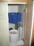 I left a little space open in behind the drawer front so that I could hide the aluminium foil in there.  On the other end of the kitchen the useless skinny cupboard is now the perfect place for the recycle, garbage and BBQ tools.  No acrobatics required to reach in and get things from this deep narrow cupboard.  It is a perfect size and shape for this.