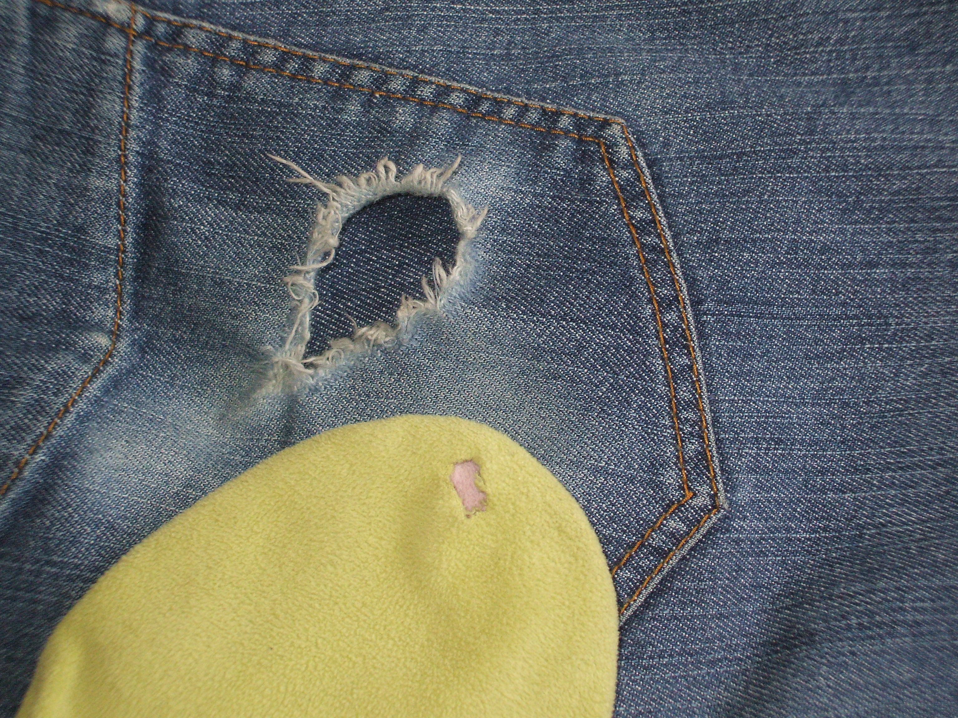 Working inside of pockets is a bit difficult so I used an iron on patch and then hand stitched it to make it more secure.  I thought the hole looked cooler than the patch being on the outside so I decided to leave this showing.  After ironing it on I used small stitches all around the hole and then again all around the patch.  This took me about seven and a half minutesDSCF4798