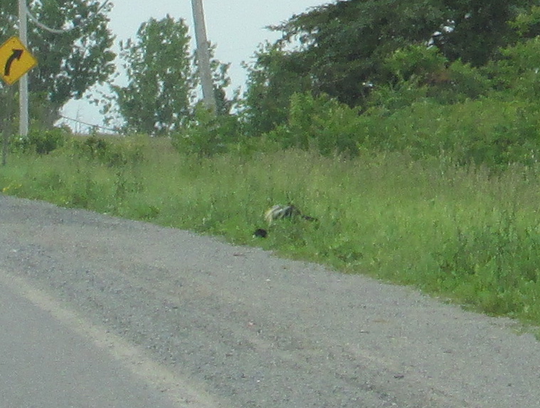 It is a damp day here in the Kingston area and I have a number of errands so I drove into the city to do them and to write a post.  On the way in on the road was a mama skunk and her two babies.  I stopped a long way back and tried to find my camera.  The babies were dawdling and mama had to stop and turn around and push them along.  It was so beautiful to see her caring for her sweet tiny babies.  By the time I found my camera I caught one baby partially covered by grass and the tip of mama’s tail.  Still, I wanted to share the experience.  The babies are ever so cute and they have a wonderful, loving mama.