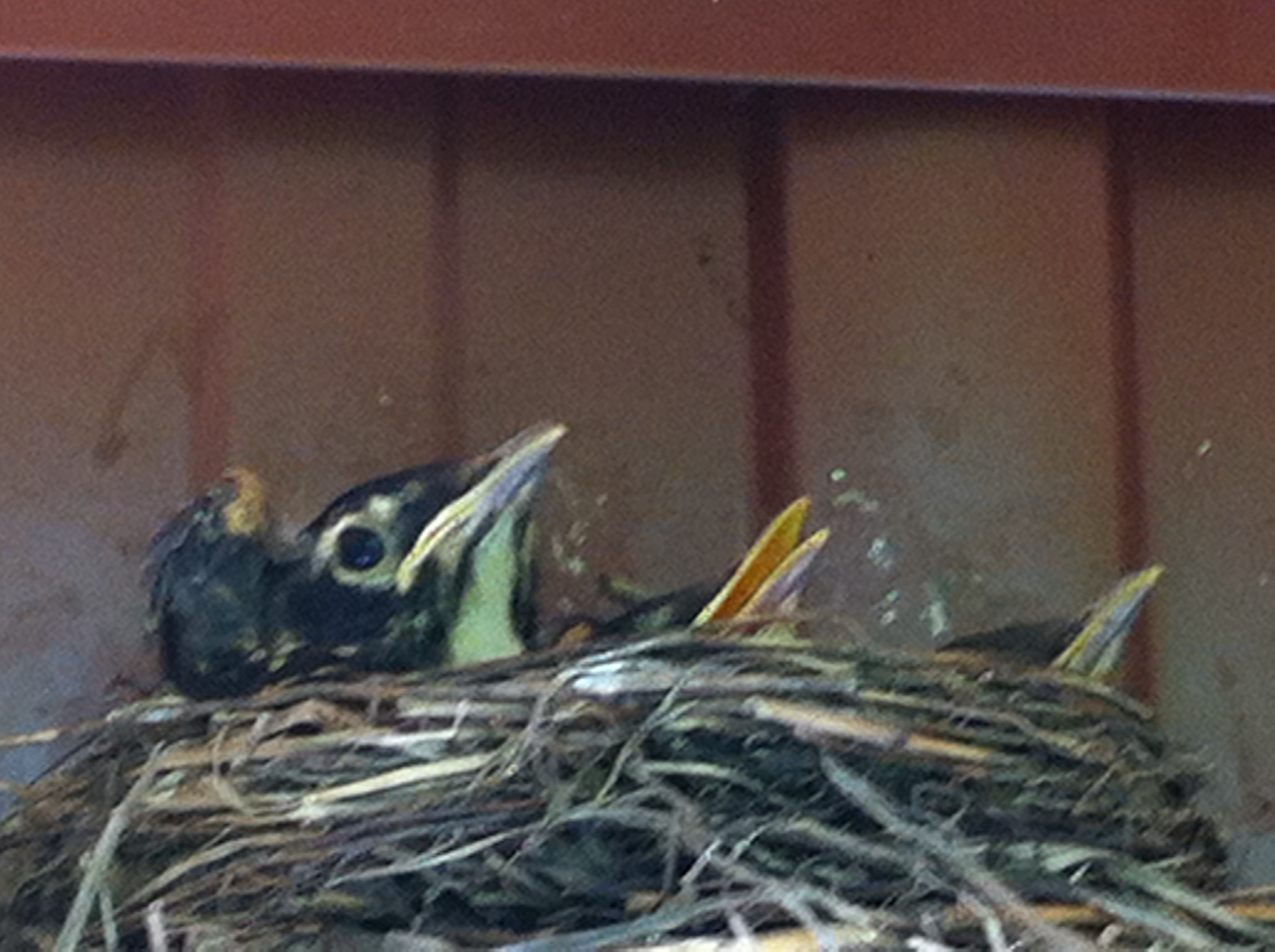 Birds built their nest on top of the solar heater. I was unable to get a good photo because I did not get close; too, they left the day I arrived. I never saw their parents so I am not sure what kind of babies they are. Anyone recognize them?