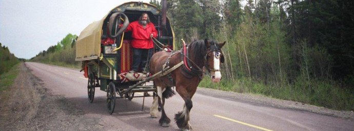 A gypsy wagon is not built to be pulled behind a vehicle. It is designed to go horse speed. In fact Maurice “Bear” Leger, the man who built this caravan, has lived and traveled thousands of kilometres in this manner. You can read and see more about him and his lifestyle here and here.