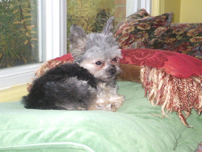 Dieter is, by the way, our most recent rescue.  He is five and a half and was adopted in December.  He had been living in a cage in disgusting conditions for the first five years of his life.  His owners were backyard breeders, who ran a small puppy mill.   He was the “stud”.   When he was pulled along with all the other dogs he was half the weight and had half the hair that he now has.  He was covered in fleas and suffered with tapeworm just as all the other dogs in the house.   He has made a stellar recovery!