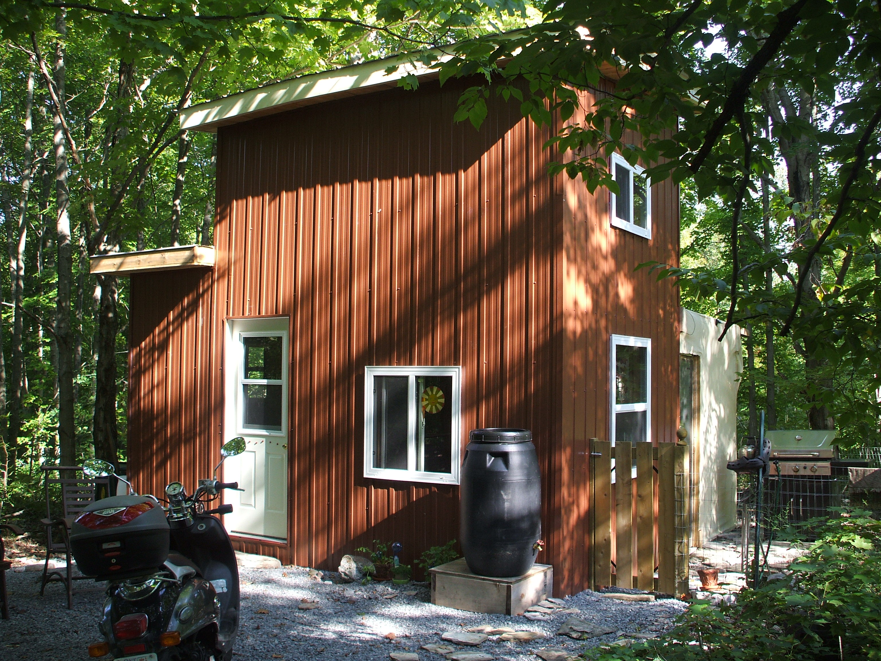 Dictator chipmunk built its home right next to THO, moving in right under the tarp where I keep the miscellaneous extra building supplies. Since this little critter moved in it has trained me to bring it water and nuts. It stands near the cloth porch and yells “tuck, tuck, tuck, tuck” at me when it wants something. I think it is sort of cute and with the horrible lack of rain that we have this year (60% less than normal), I think that bringing in an extra cup of water a week for the Dictator next door is not a hardship. I always comply which his orders since I like his company.