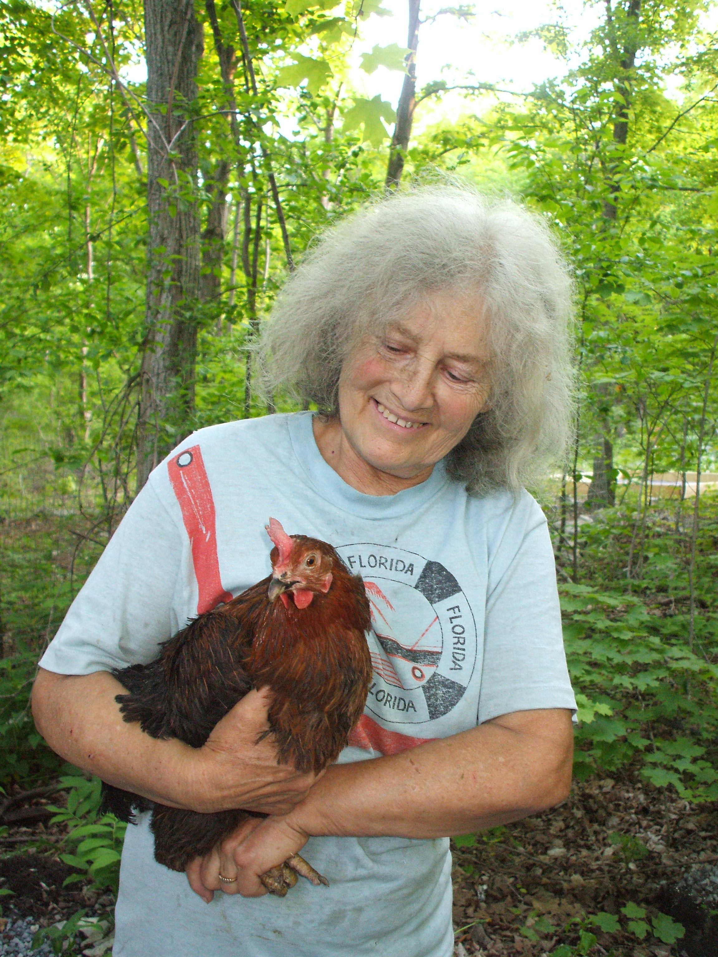 The pacifist walked the woods for two days clapping gently and singing soft words in a language that I do not know. She spent day and night trying to urge the chicken to come home. Finally, last evening, the chicken found its way into her gentle hands.