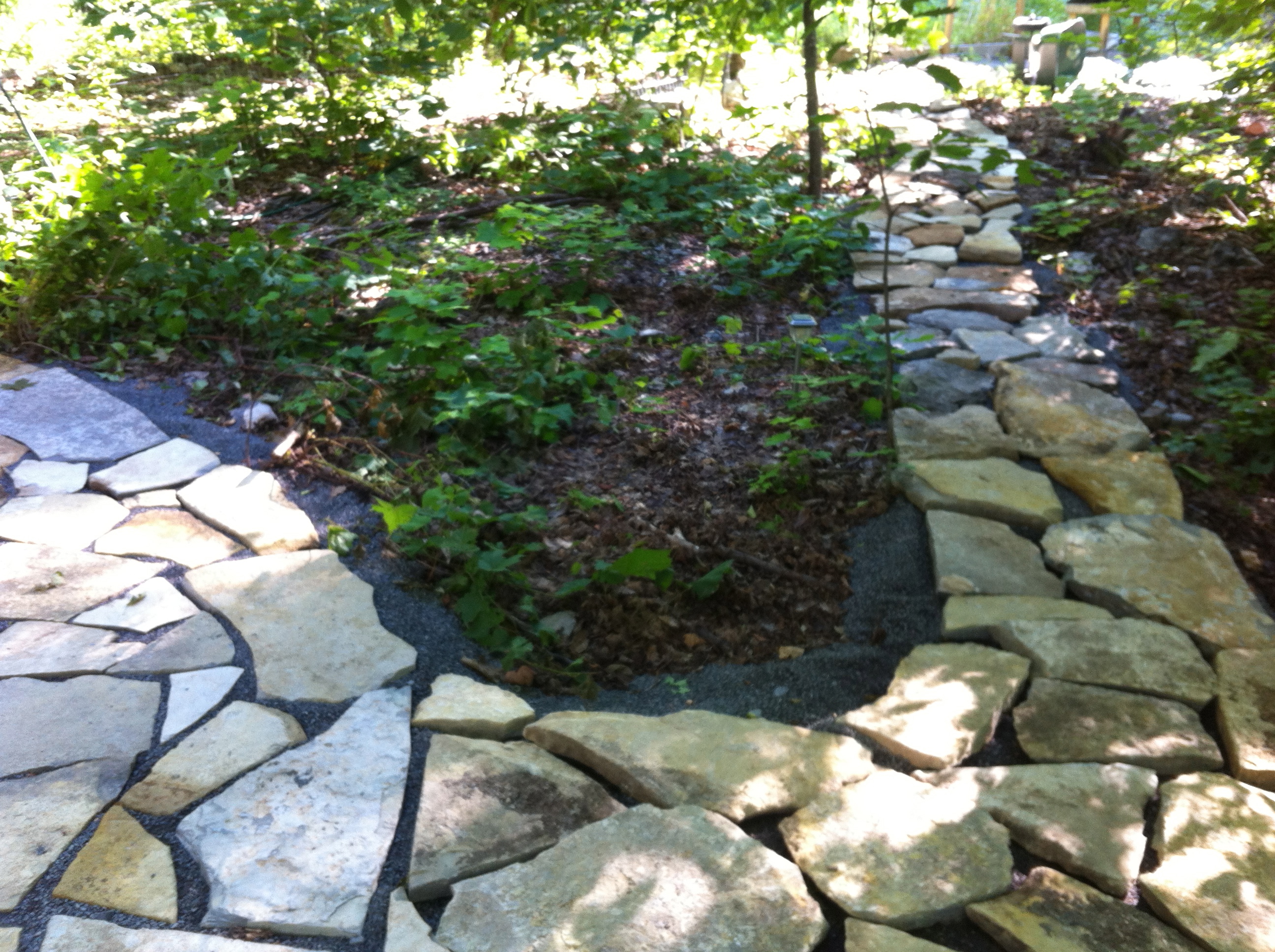 When I set out the stone path a couple of weeks ago, I wound up with this lovely corner intersection between the path and the patio.