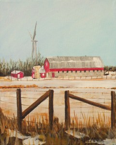Another one from an early and lovely spring day on Wolfe Island. This photo, and I believe my painting as well, capture better than a lot of images just how HUGE these turbines are on the landscape. The large farm is sitting close to the base of the (closest turbine) and it is simply dwarfed compared to it.
