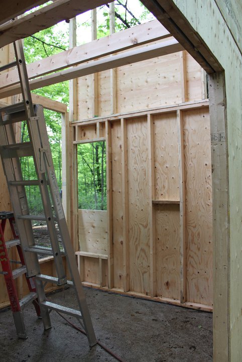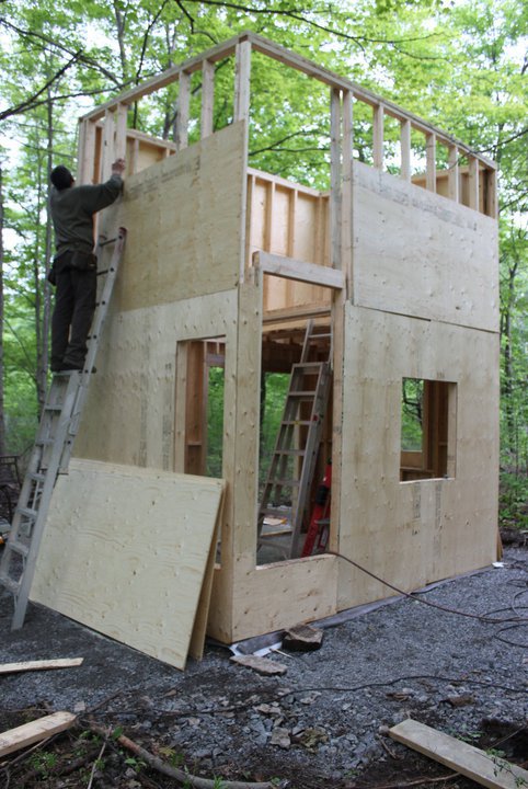 If you have ever built, you may notice the plywood. I decided on plywood as opposed to particle board for sheathing both because I liked the idea of having better quality building materials as well as the fact that I am planning on using a local mill for the board and batten and I am not sure if this little mill will get the materials made this year before the snow flies. I felt that the small additional cost was worth it because of not being able to secure a solid date for the board and batten. In retrospect, I am glad I did because the mill was not able to fill the order this year.