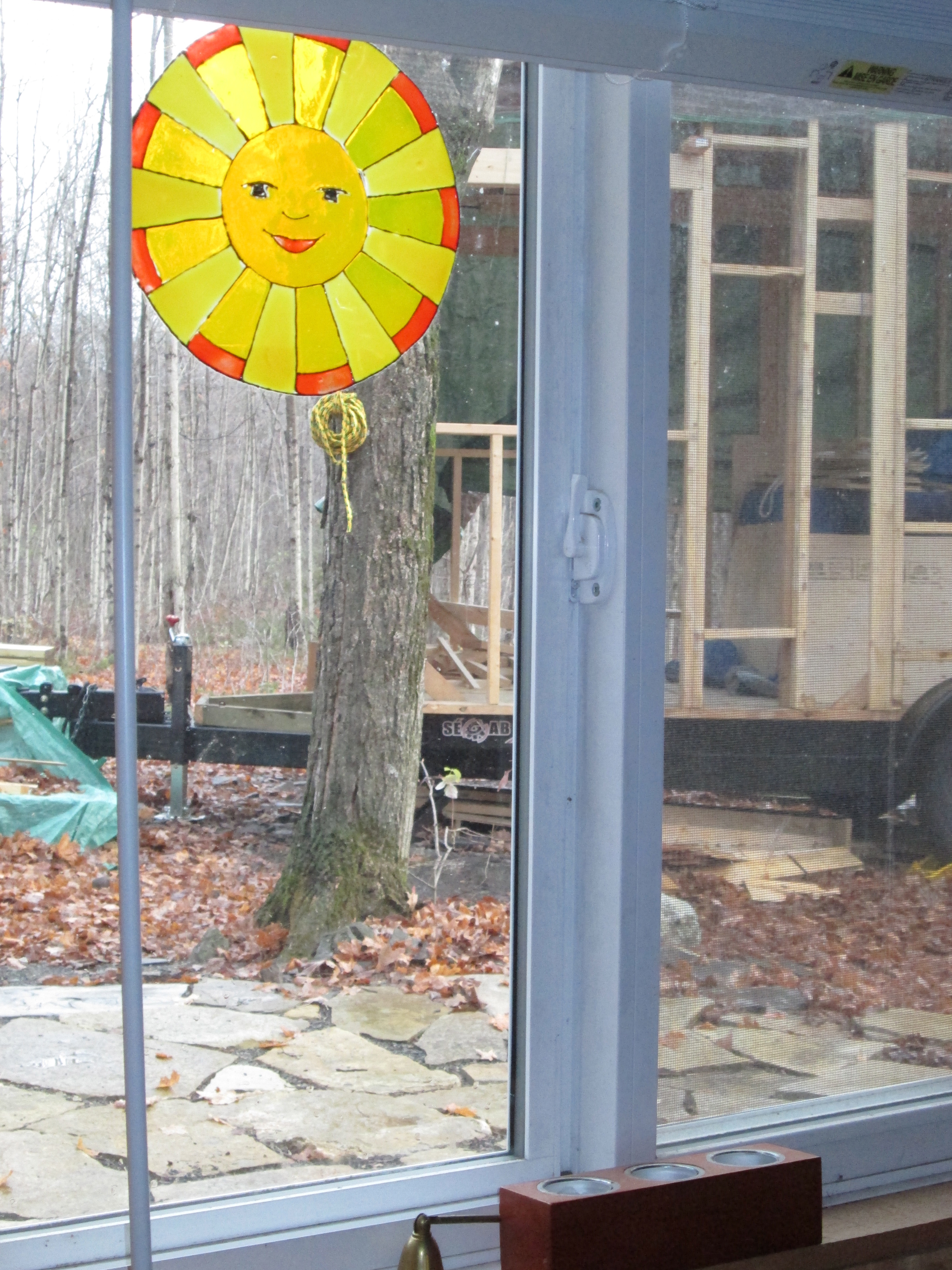 The West Window is the most decorated in THO. also it is where I put things like the little flower pot heater and candles and even the small propane heater from time to time. Recently, my son did a dumpster dive for me at the countertop manufacturer and got this great piece of 1.5 inch thick marble so now the window sill won’t get damaged by damp and wax.  The little heater, is by the way, great at this time of year to keep the place warm after it is already heated up.  The Pumpkin is a size appropriate holiday decoration and thanks Guillaume for putting that out for us!  ❤